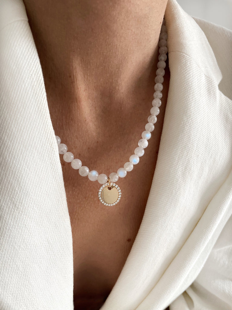 Perles en pierre de lune de 6mm de diamètre. Longueur 40cm + chainette de réglage de 3cm. Disponible avec ou sans médaille personnalisable