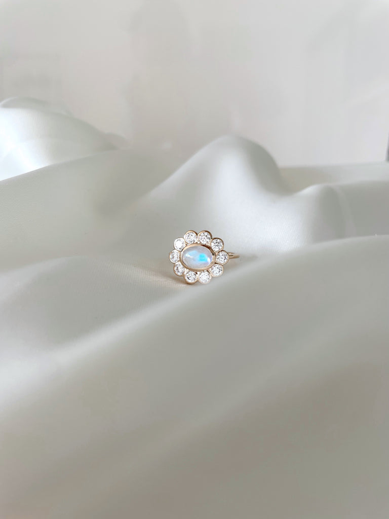 Délicate et lumineuse, la bague Renouveau met en valeur une pierre de lune soigneusement sélectionnée pour ses reflets bleutés et nacrés.