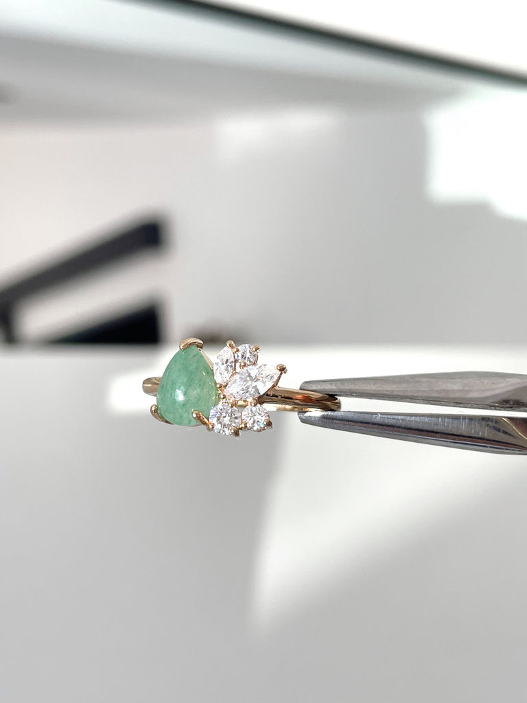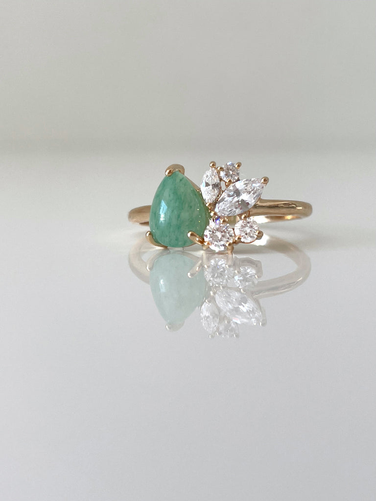 Une aventurine en son cœur, entourée de pétales de cristaux blancs. Un sertissage délicat à trois griffes qui en révèle toute la beauté.